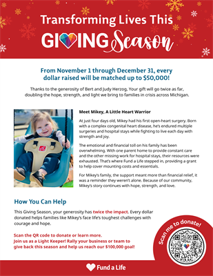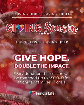 From November 1 through December 31, every dollar you give will be matched up to $50,000, thanks to the incredible generosity of Bert and Judy Herzog. Your gift will go twice as far, doubling the hope, strength, and light we bring to families in crisis across Michigan. Hear from Founder, Mark Howell as we kick off the Giving Season and create huge impact in our community.